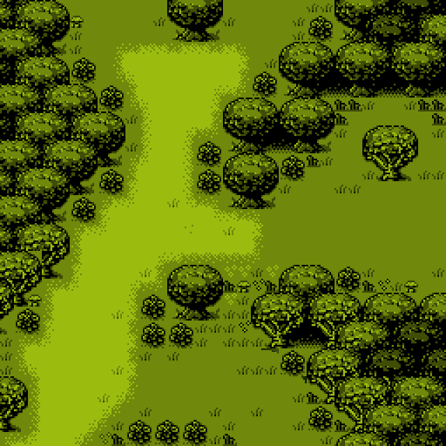 The forest was walked from one end to the other with a GPS, so I could trace every trails with precision. The result was adapted and applied on a grid, then patiently converted into pixel art, 8*8 being the base unit of my tileset. Each base unit corresponds to an identifier which will be used to convert and automatically generate the 3D map, that perfectly fits the 2D top-down version, with the right tree, at the right place.